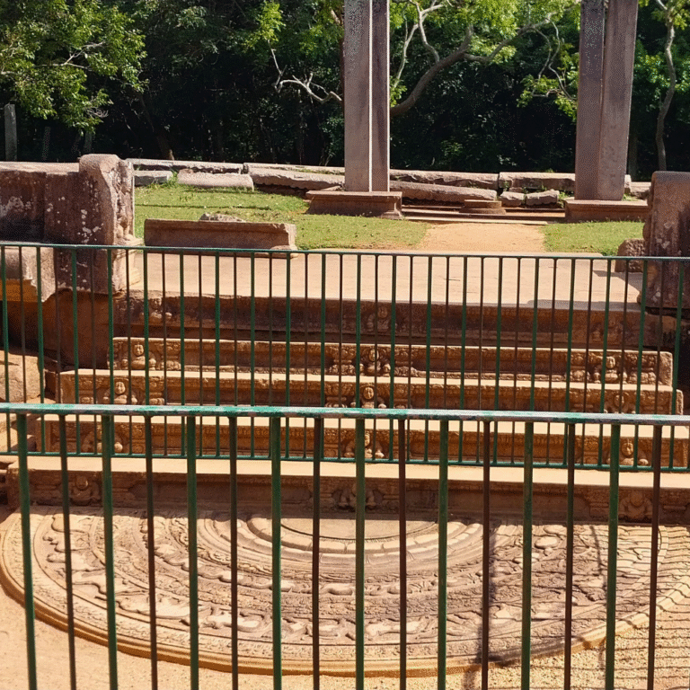 The Anuradhapura Moonstone is a beautifully carved semi-circular stone slab, a unique architectural feature of ancient Sri Lanka, often found at the base of temple staircases.